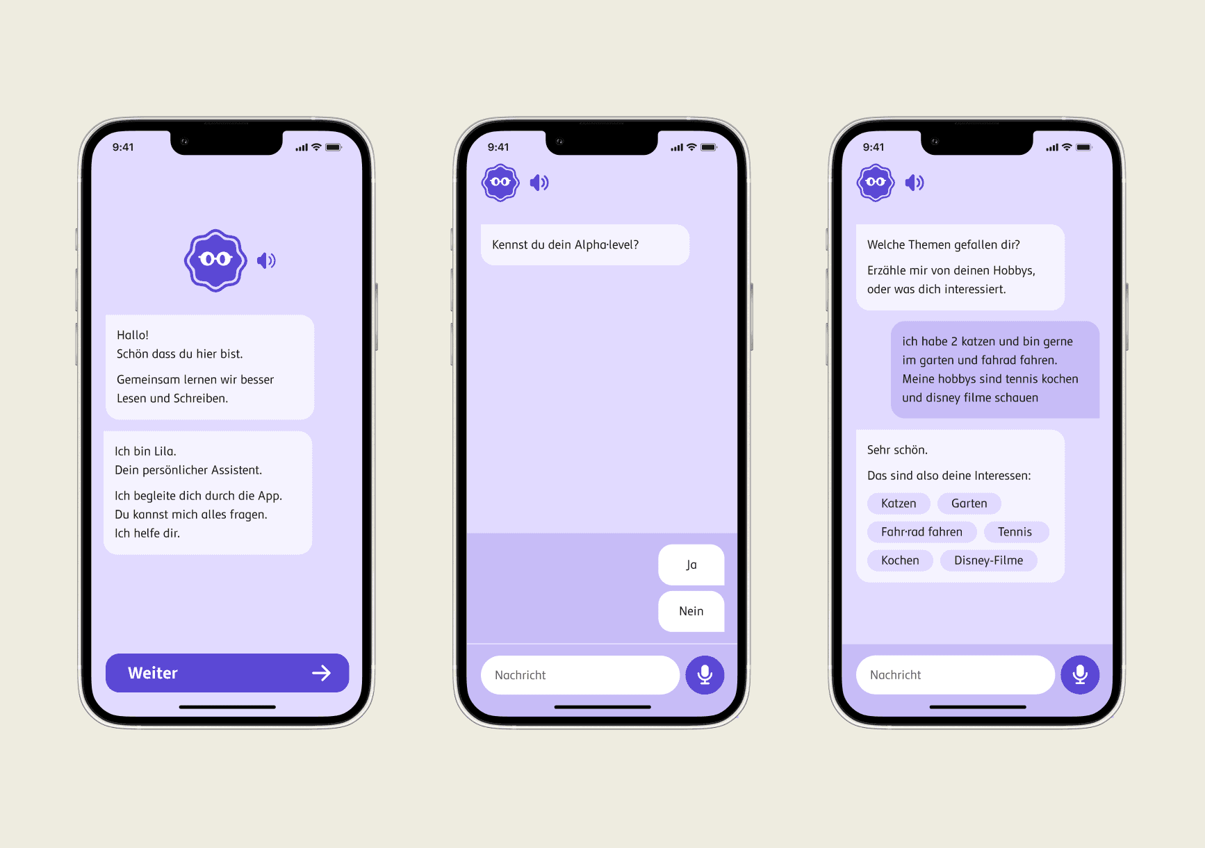 A personalised onboarding process, guided by an AI assistant in a chat dialogue, facilitates the first steps. The assistant explains the app's features and gathers information about the user's skills and preferences to deliver personalised content.
